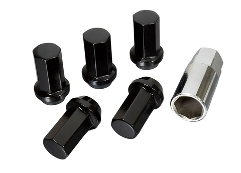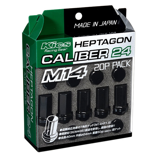 The Project Kics Heptagon Caliber 24 Lug Nuts offer a unique heptagon, 7-sided shape for added security, deterring theft by requiring a special socket not found in standard tool kits. Available in the M14 thread size, they use a 60-degree tapered seat. Each package includes a specially designed Heptagon adapter for easy installation with a 19/21Hex socket.