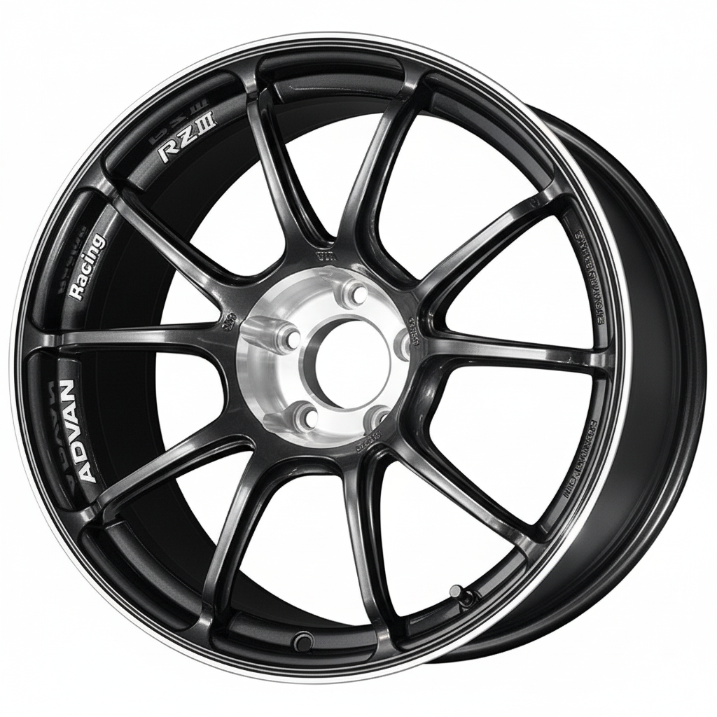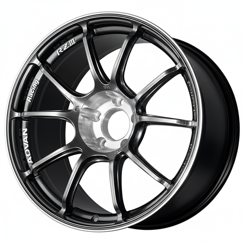 The ADVAN Racing RZIII marks the highly anticipated evolution of the long-standing RZII model. This new twin-spoke design features aggressive styling, including widely spaced spokes with "Advanced Side Cut" on one side and a unique stepped reinforcement on the narrower twin-spokes for improved strength. This model achieves a significant leap in luxury with a diamond-cut finish on the center circle, a high-end detail applied to every color option.